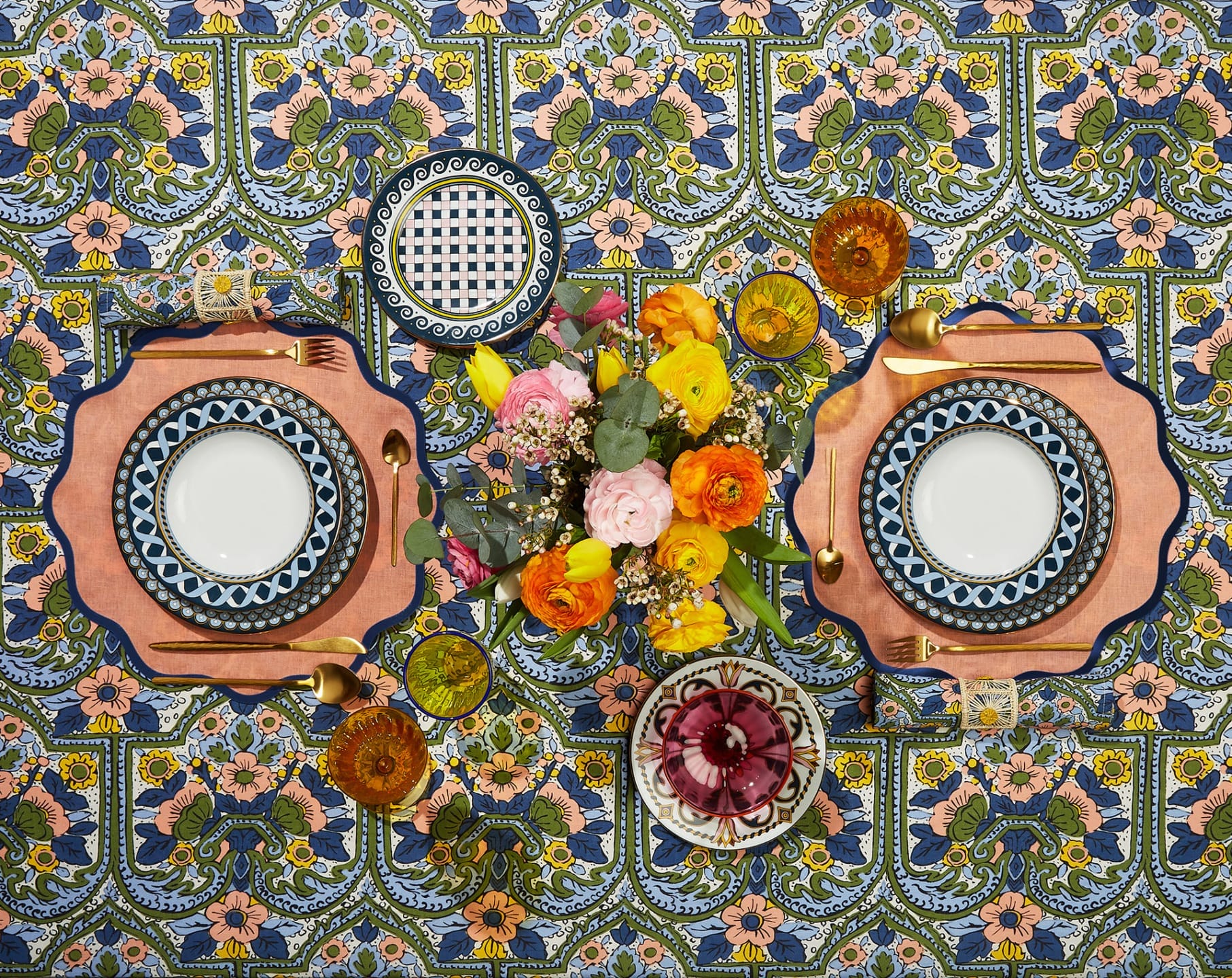 Colorful table setting with patterned plates, gold cutlery, and vibrant floral centerpiece on an intricate patterned tablecloth.