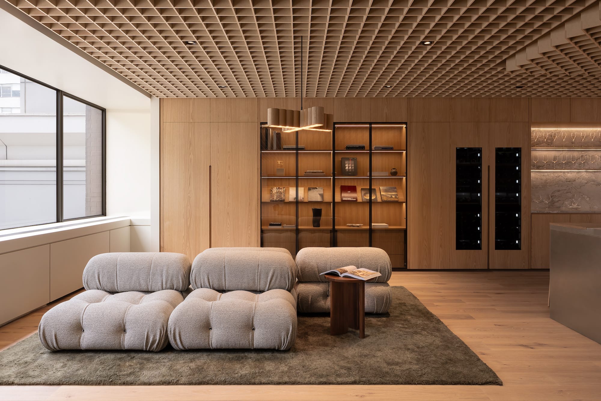 Modern office space with stylish beige tufted sofas, wooden shelves, and large windows allowing natural light.