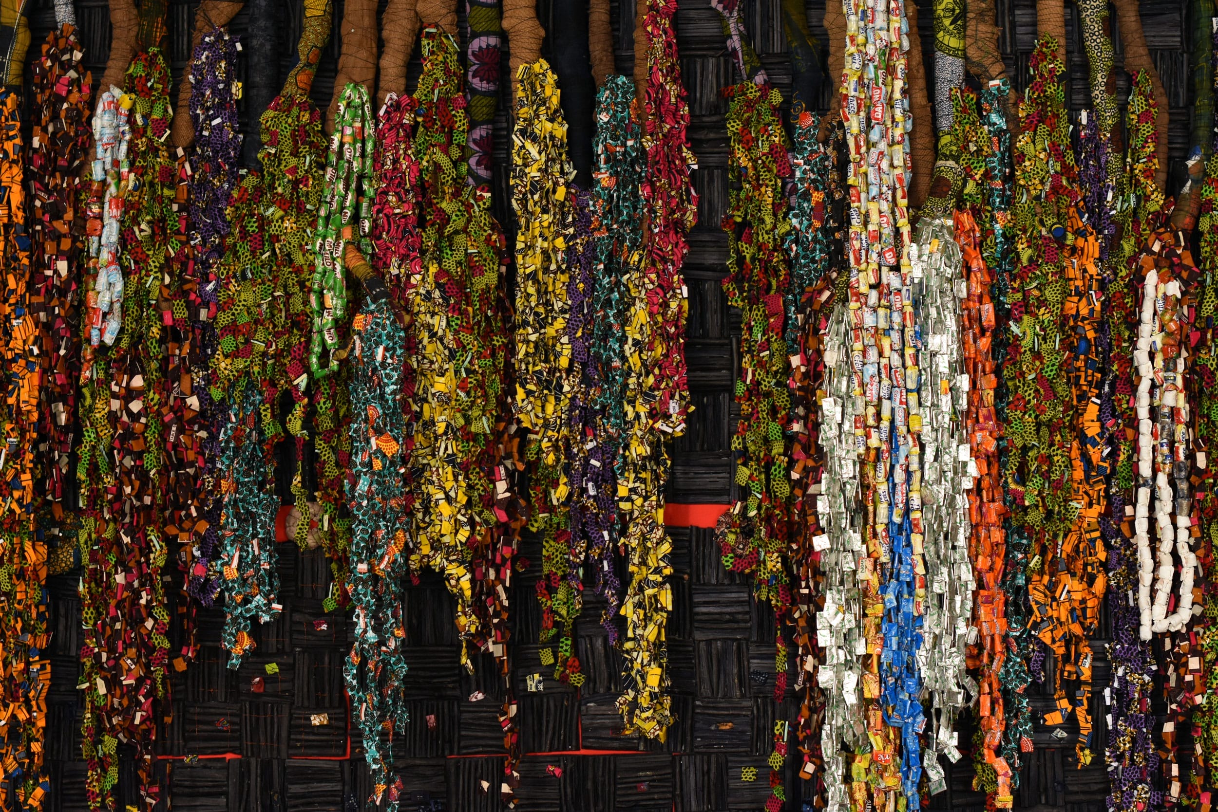 The works on show reveal themselves in an eclectic hodgepodge of styles, materials and subjects. Many have utilized materials that have become signature elements of the continent’s contemporary art: food packaging, African fabric, found metallic objects and so forth. This is seen in the packaging and cloth strips in Nigerian artist Olanrewaju Tejuoso‘s abstract wall piece to Haitian artist Pascale Monnin’s giant centerpiece installation made from parts of what appears to be window shades—their blue color clings to the sand on the ground where they were once before. There’s also Congolese artist Geraldine Tobe’s surrealist figurative depictions made with smoke on canvas, Ghanaian Godfried Donkor’s collage series “Olympians,” which reveals representations of the Senegalese national sport of traditional wrestling, and South African Ledelle Moe’s Exploded Geography, revealing pieces of concrete placed haphazardly on several long steel poles—it’s as if the earth had exploded and someone had to go and pick up the pieces.