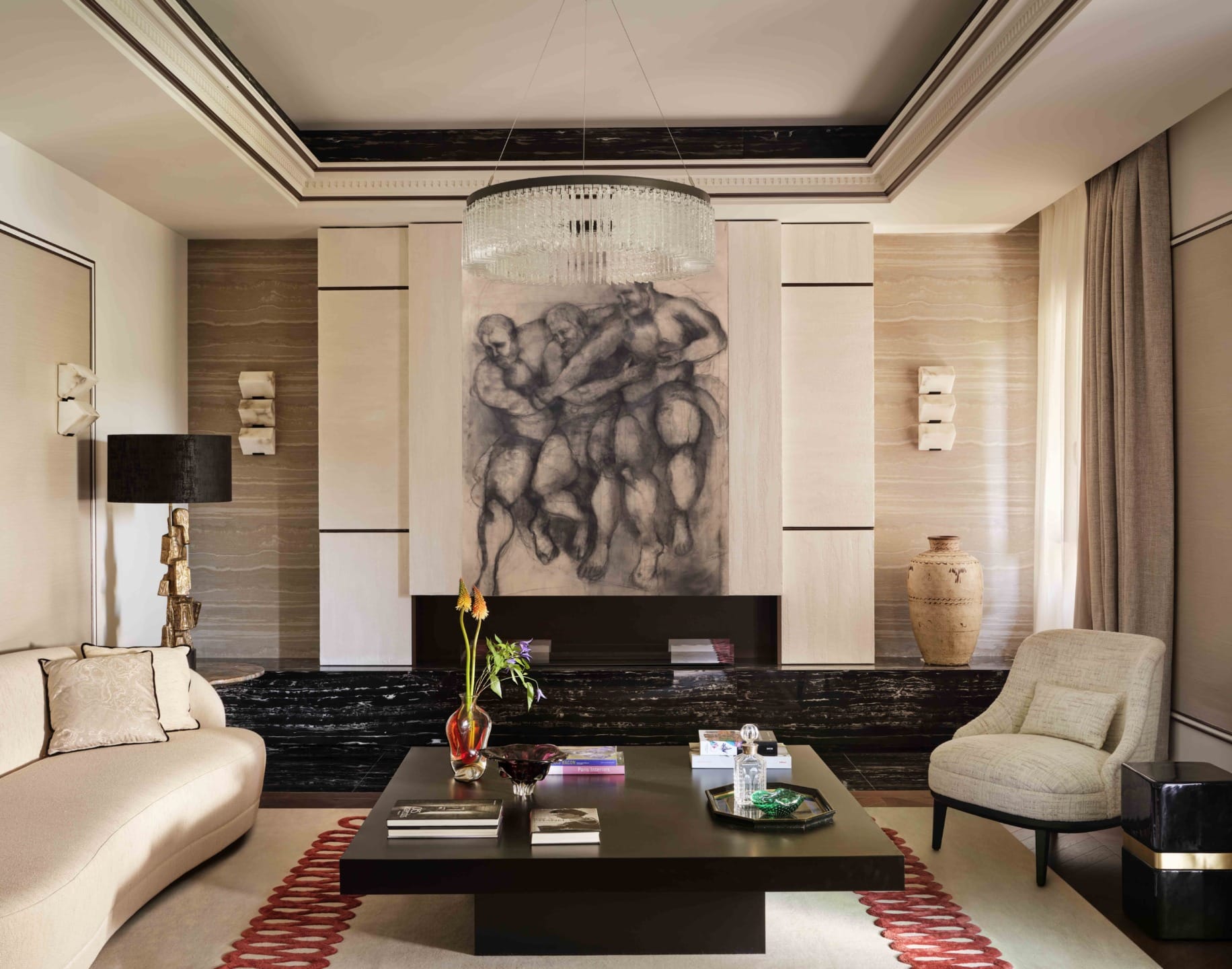 Now, the 3,200-square-foot unit encompasses three bedrooms, each with their own en suite bath. Guests enter into a marble-lined foyer, distinct for its dreamy Christophe Gaignon glass sculpture that hangs above a custom console with brass panels, its luminosity echoed in a chic nearby wall light by Tristan Auer for Veronese. To the right, glass sliding doors open to the kitchen and see-through wine room. An adjacent corridor leads to the guest rooms, culminating in a sumptuous main suite. A welcoming art-filled living room awaits visitors to the left.