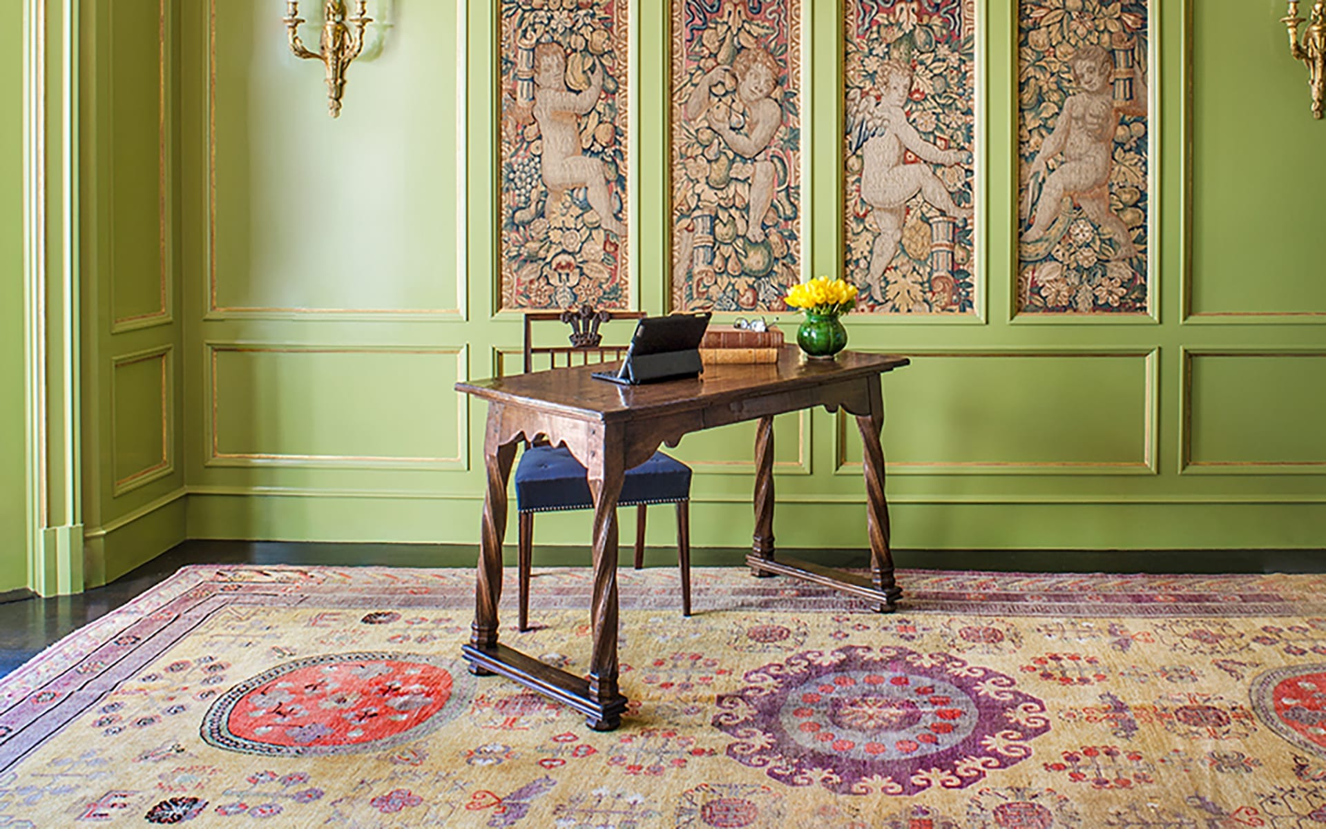 Coming from four generations of rug purveyors, it’s no surprise that Benjamin Soleimani’s earliest memories are of rugs. Following in the footsteps of his family, who has been in the business for three generations, he is known for his comprehensive knowledge of rugs and photographic memory for pattern. Here, he welcomes Galerie into Mansour, his enormous Los Angeles showroom on Melrose Avenue. From rare antiques to completely new designs, the breadth of selection is unparalleled and is considered the world’s largest collection of rugs and tapestries. Additionally, he’s partnered with some of the most celebrated designers, including Michael S. Smith and Victoria Hagan, to create extraordinary collections. But the selection doesn’t end with the thousands of options at Mansour. Soleimani also works one-on-one with designers to custom create the perfect rug to tie any space together.