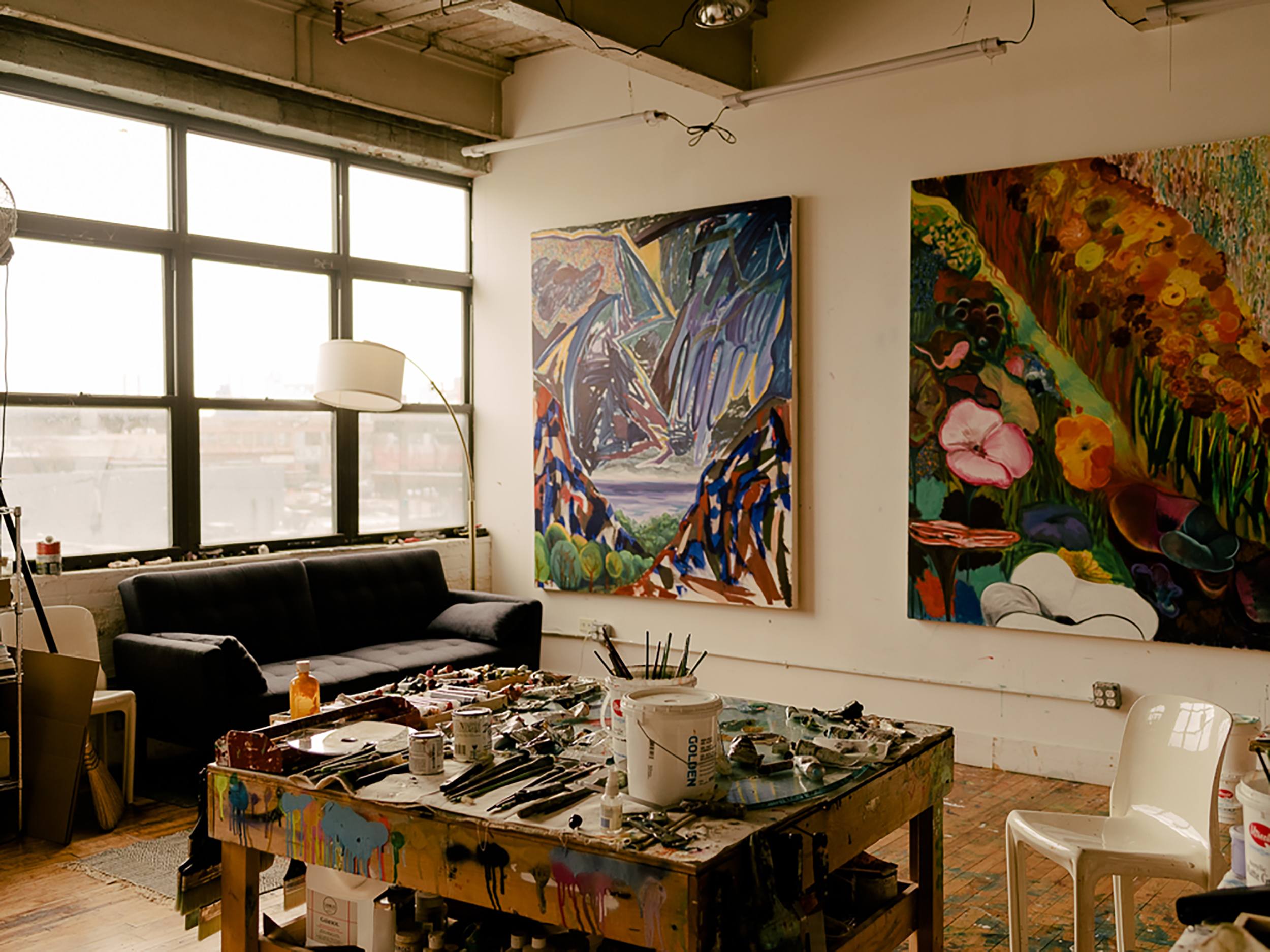 Since the 2017 Whitney Biennial, where a room was dedicated to Shara Hughes’s vividly colored invented landscape paintings, the artist’s profile has only grown. Post-biennial, her paintings have tripled in auction value, and her work has been included in group shows at Paul Kasmin, Peter Freeman Inc., and Almine Rech. Solo exhibitions were also held at Rachel Uffner and Eva Presenhuber (who both represent her), as well as at John Berggruen, Gallery Met, and Pace Prints. “I’m really trying actively to surprise myself every time I make a new painting,” says Hughes, whose pieces fall somewhere between the uncanny and the accessible. Here, Galerie pays a visit to her studio to learn more about her inspirations and process.